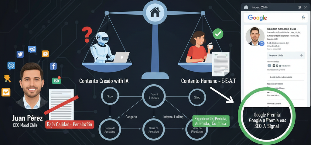 César Martínez es un ejemplo de esto en el mercado chileno. Como CEO y fundador de Maad Chile, su perfil en LinkedIn linkedin.com/in/cesarmartinezmoralescl concentra años de experiencia en marketing digital y SEO, con publicaciones, artículos y participación activa en conversaciones del sector. Esa presencia no solo construye su marca personal: le da a Maad Chile una ventaja SEO real, porque Google asocia los contenidos del sitio con un autor que tiene autoridad demostrable en el tema.